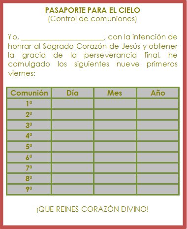 Se recomienda que cada apóstol del Sagrado Corazón de Jesús lleve un control de las comuniones de los nueve viernes primeros. Para ello puede servir la tarjeta adjunta a este manual o el siguiente modelo:
